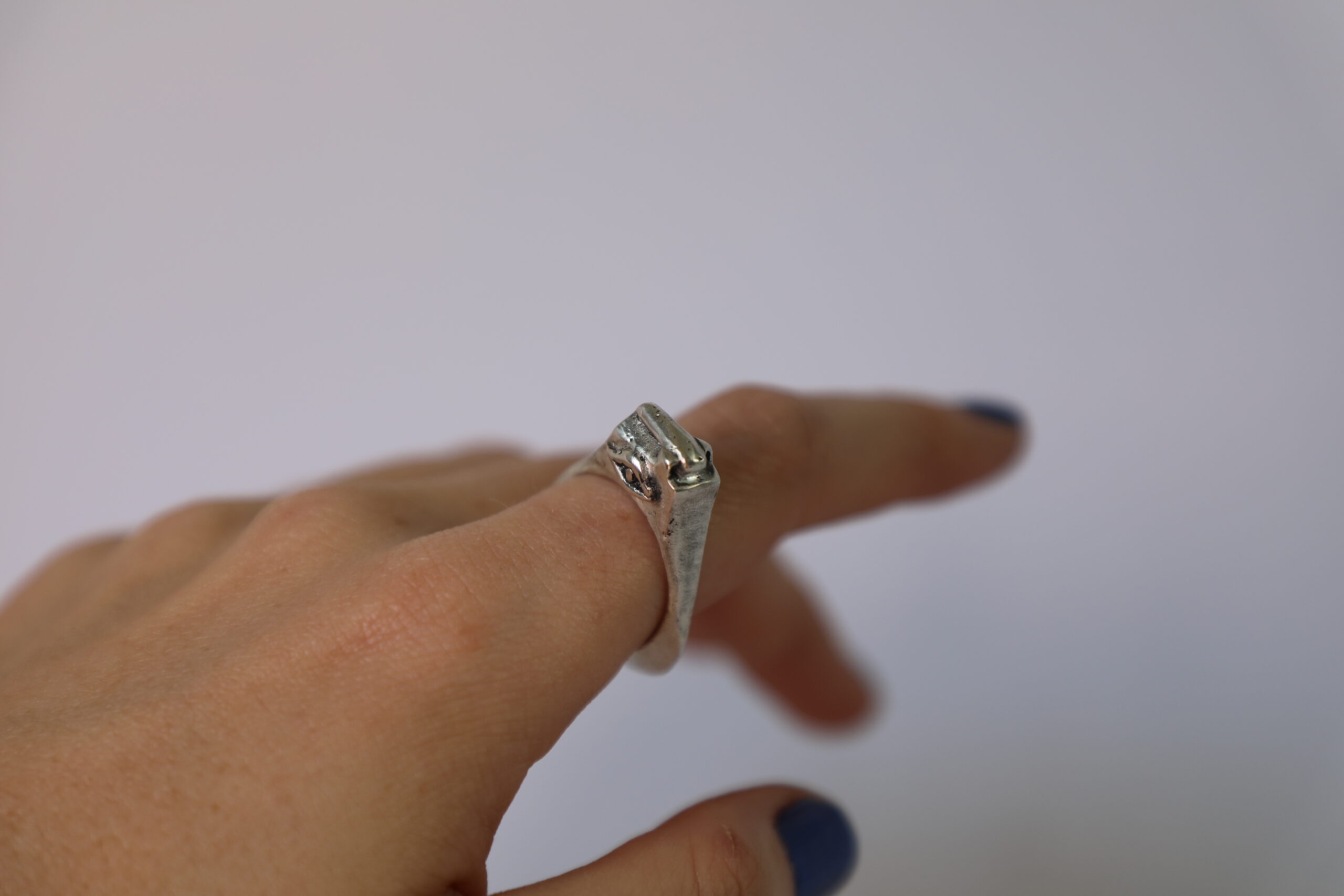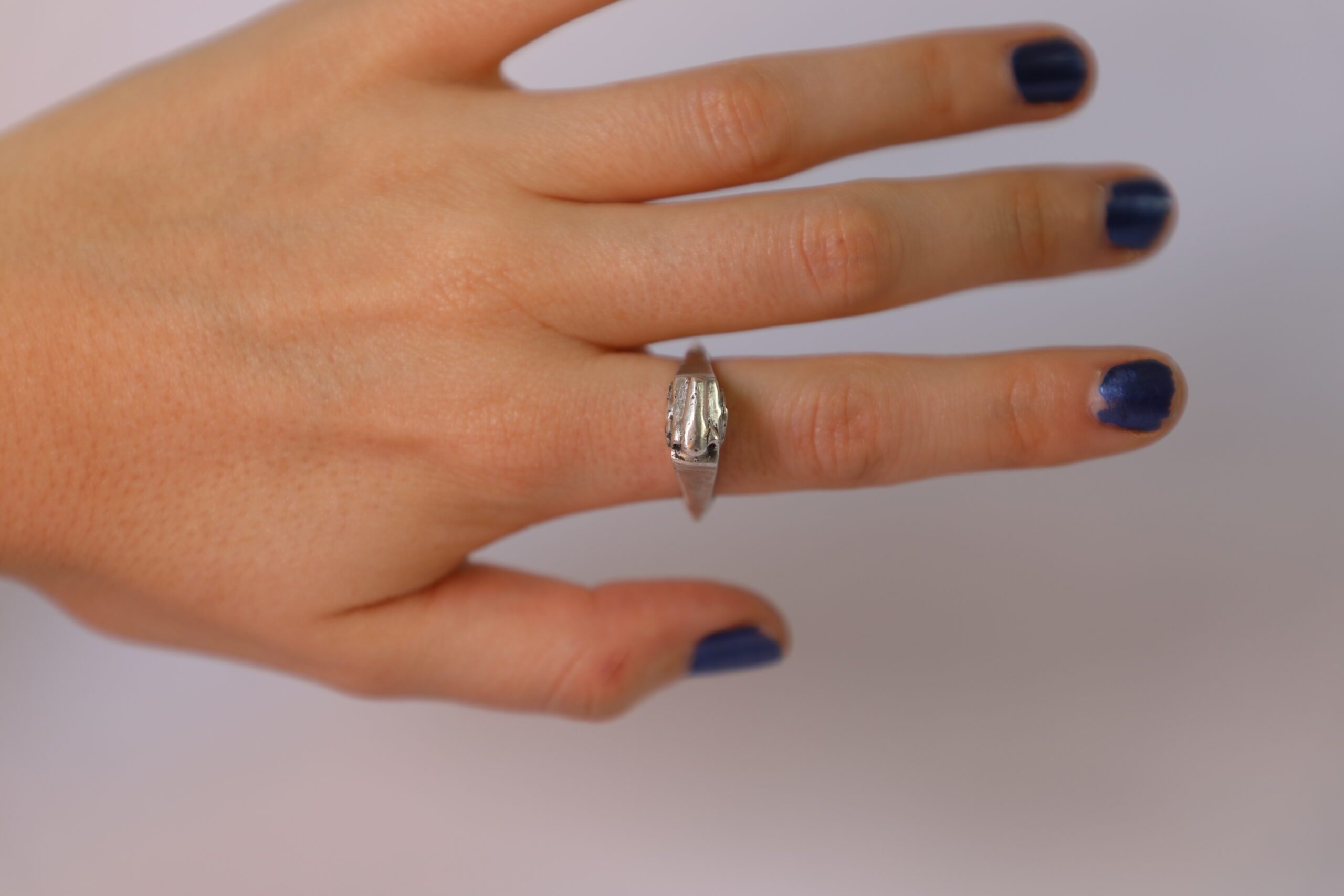Este anillo, de estructura orgánica y presencia firme, simboliza el instinto, el poder y la dualidad del deseo. Cada pieza es fundida y pulida a mano, preservando las texturas naturales del metal y la expresión viva del artesano.